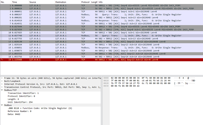 While you are at it, you can run Wireshark on the local loopback adapter to inspect the Modbus messages as they fly by: